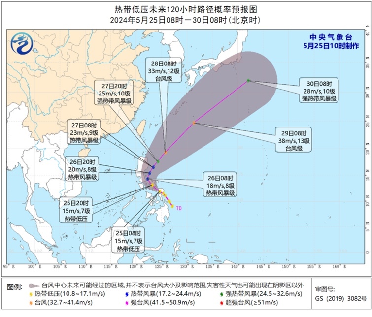 預(yù)計(jì),低壓中心將以每小時(shí)15至20公里的速度向西北方向移動(dòng),強(qiáng)度緩慢增強(qiáng),將于未來24小時(shí)內(nèi)加強(qiáng)為今年第1號臺(tái)風(fēng),26至27日將在菲律賓呂宋島東部海面逐漸轉(zhuǎn)向東北方向移動(dòng)。