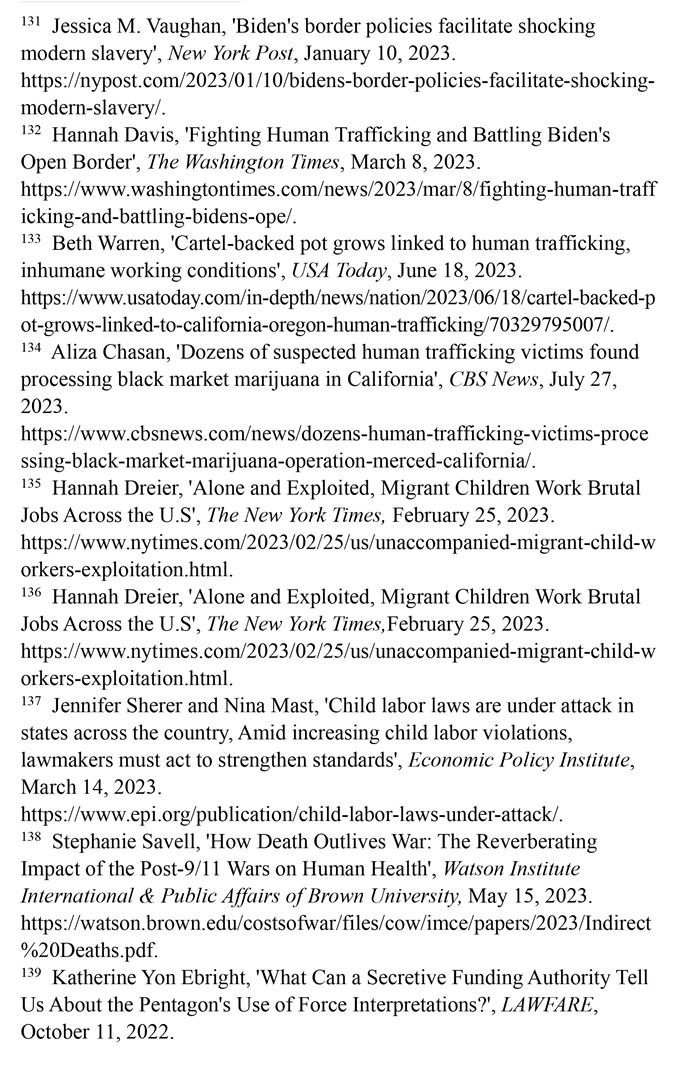 邊境政策助長現(xiàn)代奴隸制。美國政府的邊境政策加劇人口販運問題。被遺棄在邊境州城鎮(zhèn)或被運往全國各地的移民,往往處于孤立無援境地,最容易受到剝削和販運。那些非法越境后聚集在擁擠、缺乏監(jiān)管的庇護所的兒童也成為人口販子的獵物。(注131)在美國被販運的人中,72%是移民,其中大部分是通過偷渡入境,人口販運的受害者多是婦女和兒童。打擊販賣婦女聯(lián)盟的一項研究估計,60%的越境無人陪伴移民兒童被犯罪集團強迫從事兒童色情甚至販毒活動。(注132)《今日美國報》網(wǎng)站2023年6月18日報道,移民被販毒集團誘騙到加利福尼亞州北部和俄勒岡州南部的農(nóng)場從事大麻種植,遭受奴役和強迫勞動。被販賣的移民在大麻農(nóng)場遭持槍恐嚇,每天被迫工作16個小時甚至更長時間,有時連飯都吃不上。移民婦女遭到性侵犯,有些人被謀殺,尸體被丟棄在荒野中。(注133)美國哥倫比亞廣播公司新聞網(wǎng)2023年7月27日報道,近60名遭人口販運的受害者被偷運到加利福尼亞中部的一個非法大麻種植場所,被強迫加工大麻,向偷運者償還債務(wù)。(注134)