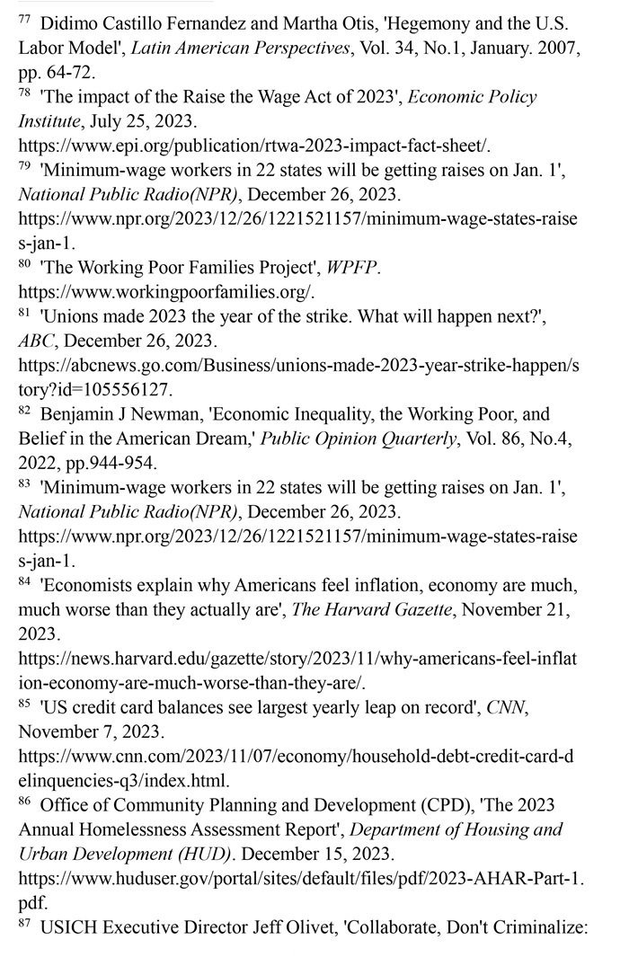 美國貧富分化加劇,“工作者貧困”現(xiàn)象凸顯,經(jīng)濟社會權(quán)利保障制度空轉(zhuǎn)。長期以來的勞資分配差異懸殊,導(dǎo)致貧富差距達到1929年經(jīng)濟大危機以來最嚴重的程度。美國有1150萬個低收入工薪家庭,聯(lián)邦最低時薪標準自2009年以來一直沒有上調(diào),2023年1美元購買力已降至2009年的70%。低收入家庭難以支付食品、房租和能源等基本生活所需,無家可歸者超過65萬人,創(chuàng)16年來新高。“工作者貧困”使辛勤勞作者的“美國夢”破碎,導(dǎo)致2023年發(fā)生了21世紀以來波及范圍最廣的罷工潮。