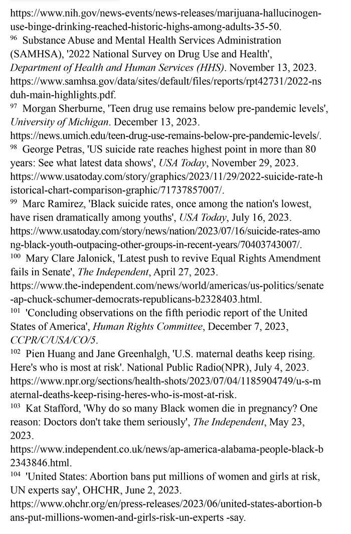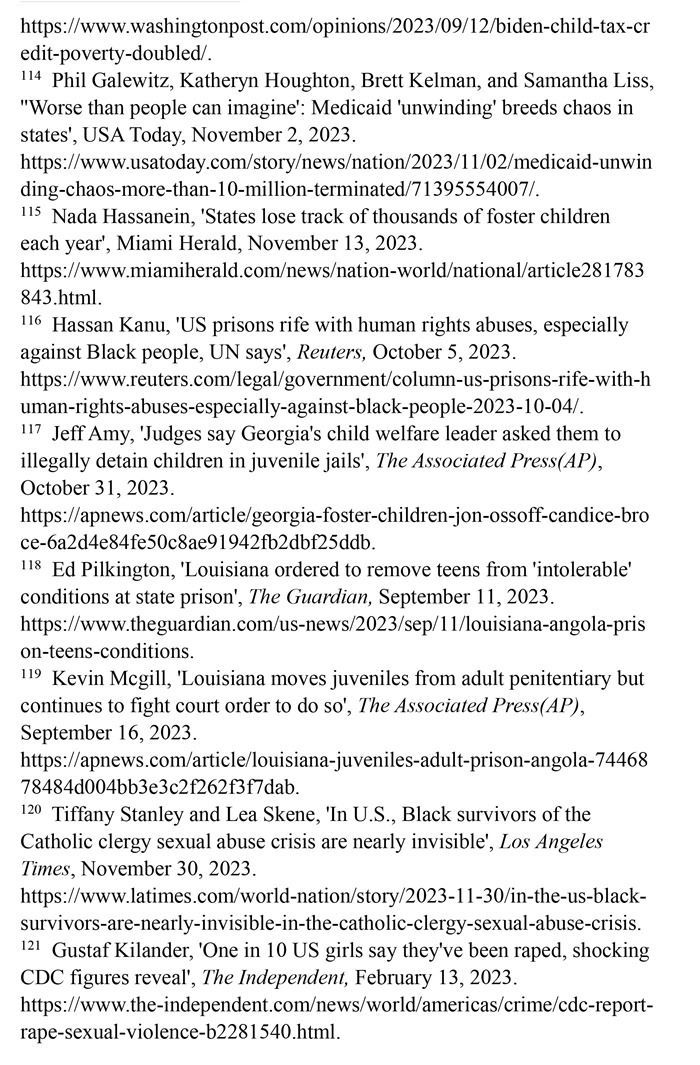 美國婦女兒童權(quán)利長期遭受系統(tǒng)性侵犯,保障性別平等的憲法規(guī)定付之闕如,至今未批準聯(lián)合國《消除對婦女一切形式歧視公約》,而且是聯(lián)合國會員國中唯一沒有批準《兒童權(quán)利公約》的國家。美國參議院2023年4月否決了保障性別平等的憲法修正提案。美國每年約有5.4萬名婦女因遭受懷孕歧視而失業(yè)。超過220萬育齡婦女無法獲得產(chǎn)科護理。至少有21個州命令禁止或嚴格限制墮胎。孕產(chǎn)婦死亡人數(shù)近20年來增加了一倍多。職場、校園、家庭等多領(lǐng)域的性暴力層出不窮。兒童的生存權(quán)與發(fā)展權(quán)堪憂。大量兒童被排除出醫(yī)療補助計劃。槍支暴力成為兒童死亡的主要原因。毒品濫用在青少年群體中蔓延。46個州被發(fā)現(xiàn)瞞報約3.48萬例寄養(yǎng)兒童失蹤案件。