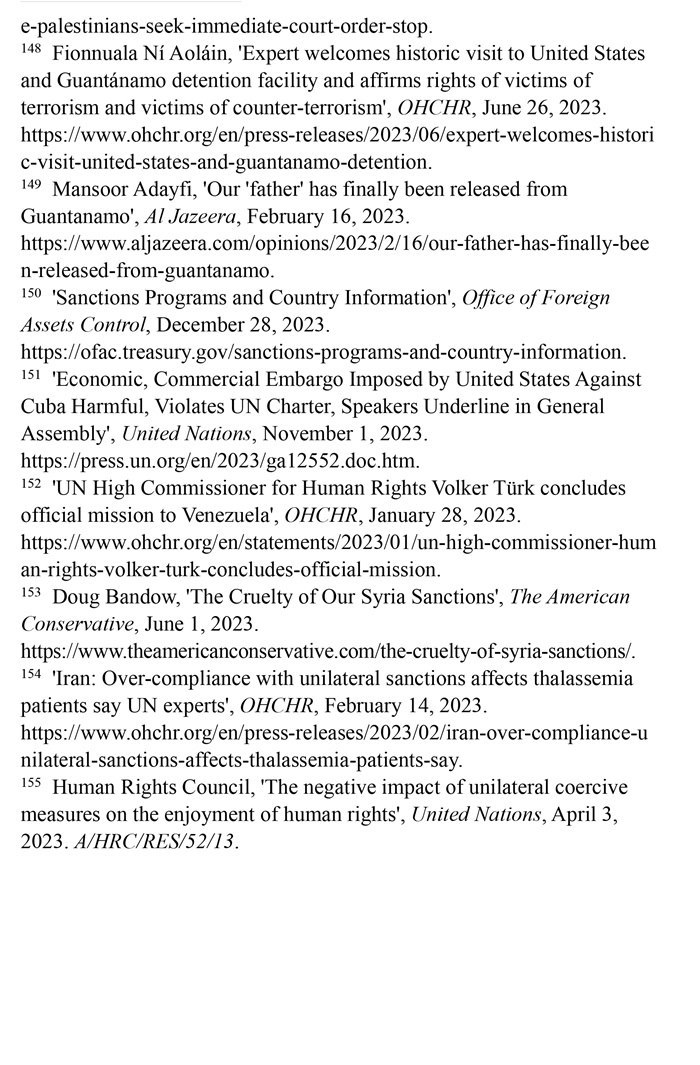 長期濫施單邊制裁造成嚴重人道主義后果。自1950年以來,美國使用的制裁次數(shù)居全球之首。根據(jù)美國財政部2023年12月28日公布的數(shù)據(jù),美國制裁的國家超過20個。(注150)第78屆聯(lián)合國大會發(fā)言人2023年11月1日指出,美國對古巴實施的經(jīng)濟、商業(yè)和金融封鎖違反了《聯(lián)合國憲章》,對古巴人民造成了毀滅性影響。(注151)聯(lián)合國大會2023年11月2日通過決議,再次敦促美國終止對古巴長達60多年的經(jīng)濟、商業(yè)和金融封鎖,這是聯(lián)合國大會連續(xù)第31年通過類似決議。2023年1月28日,聯(lián)合國人權(quán)事務(wù)高級專員沃爾克·圖爾克在訪問委內(nèi)瑞拉后表示,2017年以來美國施加的制裁加劇了委內(nèi)瑞拉的經(jīng)濟危機,嚴重阻礙人權(quán)的實現(xiàn)。(注152)“美國保守派”網(wǎng)站2023年6月1日報道,美國制裁進一步加劇了敘利亞人民的貧困。敘利亞70%的人口面臨食物短缺,其中1200萬人三餐不繼,290萬人食不果腹。(注153)聯(lián)合國人權(quán)理事會單邊強制措施對人權(quán)負面影響問題特別報告員阿萊娜·杜晗2023年2月14日指出,美國對伊朗的制裁減少了地中海貧血癥患者從國外進口救命藥物的機會,導(dǎo)致伊朗患者的并發(fā)癥和死亡率增加,是對健康權(quán)的侵犯。(注154)聯(lián)合國人權(quán)理事會2023年4月3日通過決議指出,單邊強制性措施會對目標國家廣大民眾的人權(quán)產(chǎn)生深遠影響,對窮人和處境最脆弱的人影響尤為嚴重。決議譴責某些大國繼續(xù)單方面適用單邊強制性措施。美國在該決議表決中投了反對票。(注155)