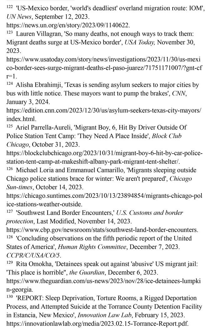入境移民遭受酷刑及其他不人道待遇。2023財年,在美國南部邊境遭逮捕或驅(qū)逐的移民總數(shù)達240多萬人,再創(chuàng)歷史新高。(注127)聯(lián)合國人權(quán)事務(wù)委員會對移民在美國受到長時間的拘留表示擔憂,批評美國的拘留所條件惡劣,人滿為患,被拘押者無法獲得食物、水和醫(yī)療服務(wù),導(dǎo)致包括兒童在內(nèi)的許多人死亡;公共和私營移民拘留設(shè)施存在性暴力、長期單獨監(jiān)禁、虐待等侵犯人權(quán)問題。(注128)英國《衛(wèi)報》網(wǎng)站2023年12月6日報道,由美國私人監(jiān)獄公司CoreCivic運營的、位于佐治亞州蘭普金的斯圖爾特拘留中心存在長期單獨監(jiān)禁、性虐待、醫(yī)療疏忽以及強迫勞動等令人擔憂的問題。(注129)創(chuàng)新法律實驗室于2023年2月15日發(fā)布報告揭露,由CoreCivic運營的、位于新墨西哥州埃斯坦西亞的托蘭斯縣拘留所存在對被關(guān)押者實施酷刑現(xiàn)象。在夜間,每隔15分鐘就會有一名警衛(wèi)開著收音機的最大音量走過這些房間,大聲地敲著門,并用手電筒強光照進房間,吵醒任何可能睡著的人。在寒冷的天氣里,每個房間的通風管道整夜都在吹冷空氣。一些人試圖用衛(wèi)生紙或毯子蓋住通風口,但警衛(wèi)們拿走了用來阻擋冷空氣的任何東西。這些牢房里,廁所污水和糞便溢出,人們被迫睡在臭氣熏天的地板上。(注130)