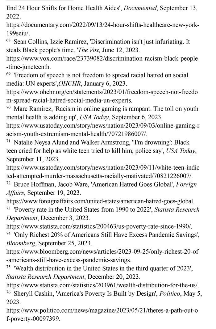 少數(shù)族裔遭遇職場歧視。美國一家名為“溫室”的招聘軟件公司發(fā)布的《2023年求職者面試經(jīng)歷報告》顯示,招聘過程中的歧視現(xiàn)象“相當令人擔憂”。34%的求職者在面試中遇到過歧視性問題,近1/5的求職者曾試圖通過在簡歷中更改姓名,以避免受歧視性招聘行為的影響。在改名的求職者中,有45%是為了讓自己聽起來“不那么有族裔特點”。(注65)英國《衛(wèi)報》網(wǎng)站2023年4月23日披露,美國政府數(shù)十年來刻意逃避勞工保護責任,壓榨少數(shù)族裔勞工。紐約的有色族裔護工不僅被迫接受連續(xù)長時間的工作,薪資還受到克扣。不少護工因此罹患失眠、慢性病等疾病,對護工及其家庭造成嚴重傷害。(注66)少數(shù)族裔勞工一直嘗試通過各種渠道爭取權(quán)利保障,但在一些利益集團阻礙下成效寥寥。(注67)沃克斯新聞網(wǎng)2023年6月12日報道,在美國,非洲裔一直比白人掙得少。這種差異意味著在種族歧視的影響下,非洲裔時間價值明顯低于白人,為了彌補歧視造成的工資差距,非洲裔工人每天必須多工作2.7小時。(注68)