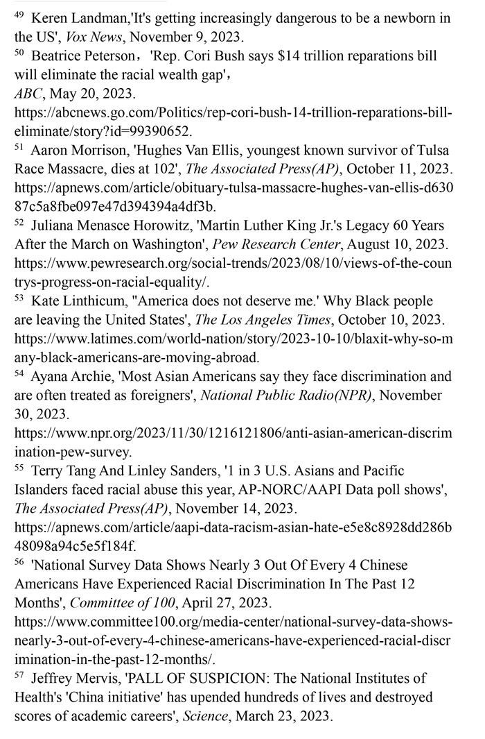 對非洲裔種族迫害的賠償遙遙無期。美國南北戰(zhàn)爭結(jié)束不久后,美國政府承諾向曾被奴役的每一個非洲裔家庭進行賠償,但一百多年來這一承諾從未兌現(xiàn)。1989年,美國眾議院非洲裔議員約翰·科尼爾斯提出“研究和制定非洲裔美國人賠償提案委員會法案”(H.R.40法案),但這一法案數(shù)十年來從未進入過國會表決程序。(注50)1921年,美國俄克拉何馬州塔爾薩地區(qū)發(fā)生針對非洲裔的種族屠殺事件,導(dǎo)致數(shù)百人遇害。為塔爾薩大屠殺最后3位已知幸存者爭取賠償?shù)脑V訟仍未定案,而其中年齡最低的幸存者休斯·范·埃利斯已于2023年10月去世。(注51)皮尤研究中心2023年8月10日發(fā)表的報告顯示,83%的非洲裔美國人表示,美國政府所做的確保平等的努力還遠遠不夠。(注52)許多不滿美國政治和種族歧視的非洲裔選擇離開。離開美國的非洲裔在葡萄牙、加納、哥倫比亞和墨西哥等地建立了新的社區(qū),這已然成為一種名為“Blaxit”的潮流(“Black”和“exit”的結(jié)合),并在社交媒體上廣泛流傳。他們高呼:“美國配不上我!”(注53)