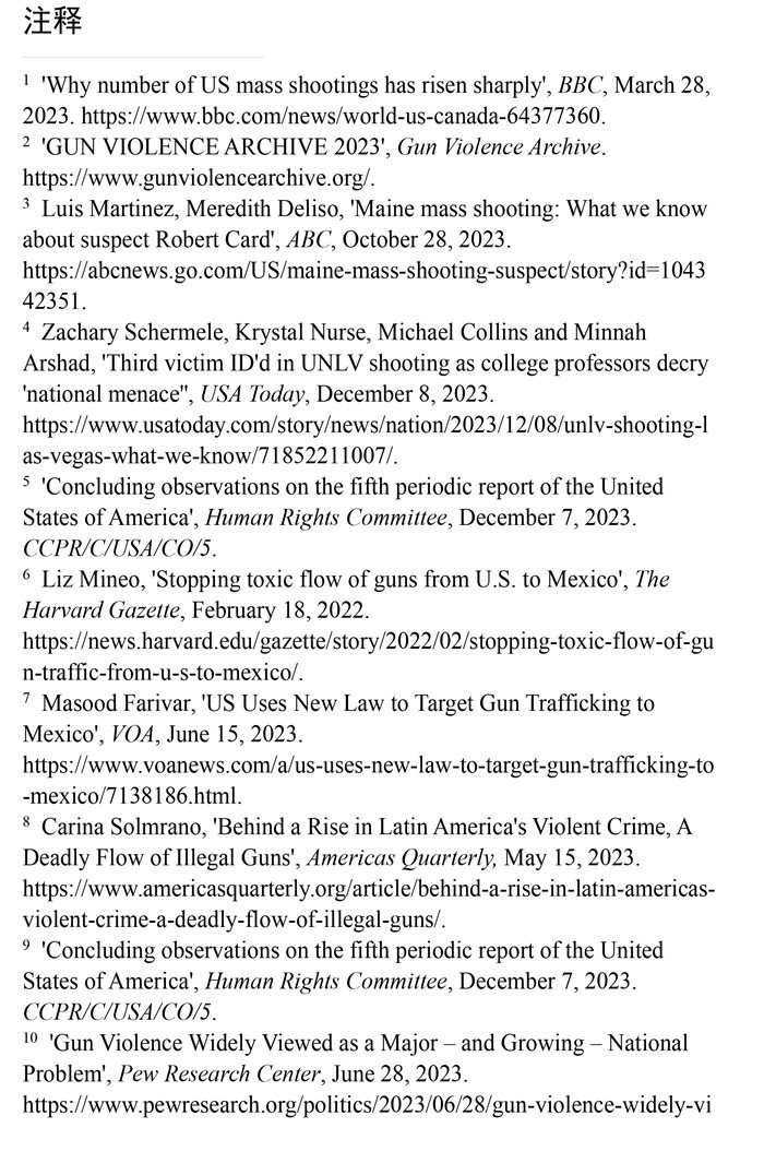 槍支暴力造成慘痛生命代價。數(shù)據(jù)顯示,美國所有類型的槍支暴力事件都呈上升趨勢。(注1)根據(jù)“槍支暴力檔案”網(wǎng)站統(tǒng)計的數(shù)據(jù),2023年美國至少發(fā)生了654起大規(guī)模槍擊事件。槍支暴力導(dǎo)致近4.3萬人死亡,平均每天死亡117人。(注2)例如,美國廣播公司新聞網(wǎng)站2023年10月28日報道,緬因州發(fā)生大規(guī)模槍擊事件,造成至少18人死亡,13人受傷。(注3)《今日美國報》網(wǎng)站2023年12月6日報道,拉斯維加斯3名大學教授被一名前同事槍殺。美國大學教授協(xié)會主席艾琳·馬爾維稱,槍支暴力是“不可接受的國家威脅”,敦促美國政府進行槍支政策改革。(注4)美國與槍支有關(guān)的傷亡人數(shù)激增,引發(fā)聯(lián)合國人權(quán)事務(wù)委員會的嚴重關(guān)切。(注5)