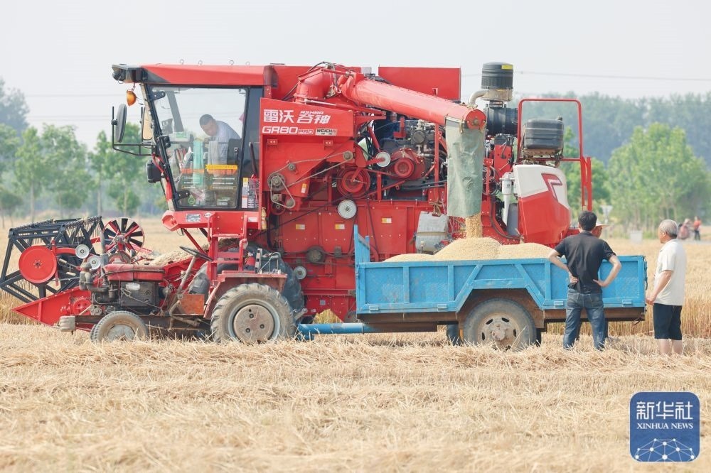 5月25日,河南省周口市商水縣湯莊鄉(xiāng)吳樓村村民在搶收小麥。新華社發(fā)(高建中攝)
