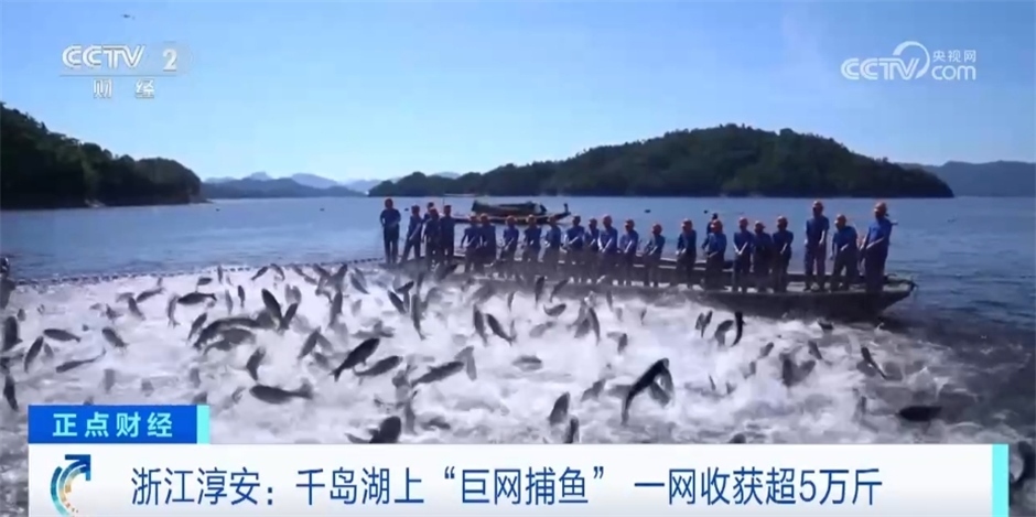 浙江淳安:千島湖上“巨網(wǎng)捕魚(yú)” 一網(wǎng)收獲超5萬(wàn)斤