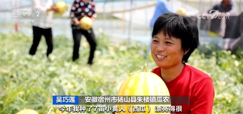 安徽碭山縣朱樓鎮(zhèn)瓜農(nóng)吳巧蓮介紹:“今年我種了7畝小黃人西瓜,漂亮得很,產(chǎn)量在8000斤左右,價(jià)格每斤3元左右,比普通的瓜一斤貴一元多。這個(gè)瓜賣30多元一個(gè)?!?/p>