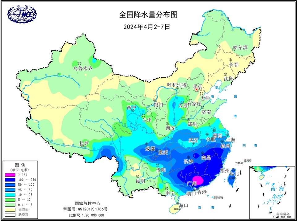 14次區(qū)域暴雨過(guò)程襲擊我國(guó),較常年同期明顯偏多。春季,我國(guó)共發(fā)生14次區(qū)域暴雨過(guò)程,較常年同期偏多3.8次。4月2-7日的暴雨過(guò)程為1961年以來(lái)同期第八強(qiáng),受其影響,我國(guó)華東南部、華中南部、華南東部及貴州東北部、重慶、四川中東部等地累計(jì)降水量50~100毫米,浙江西南部、福建、江西南部、湖南東南部、廣東大部等地累計(jì)降水量100~250毫米,局地超過(guò)250毫米(圖5);湖南茶陵(203.2毫米)、廣東始興(145.3毫米)日降水量超過(guò)極端閾值。
