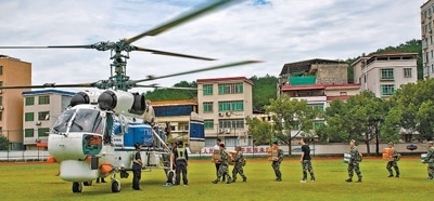 6月17日,廣東省梅州市平遠縣體育場,直升機在運送救援物資。馮錫權(quán)攝(人民視覺)