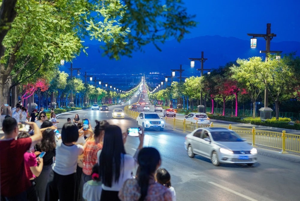 2024年5月21日,游客在升級改造后的運城市“鹽湖006號燈桿”觀景臺拍照。