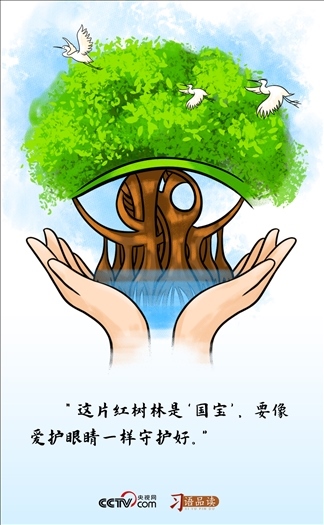 “國寶”一詞強調了紅樹林不可估量的價值,及其在國家發(fā)展中的重要地位?!跋駩圩o眼睛一樣守護好”,則重申了保護紅樹林的緊迫性和重要性。