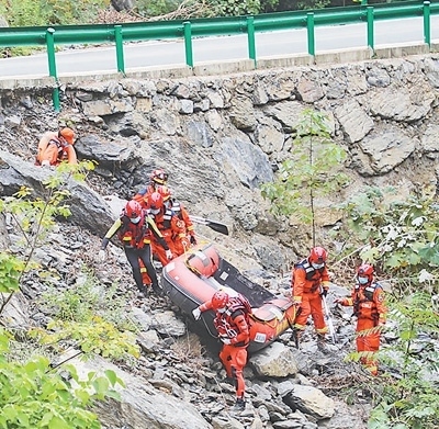 湖北省消防救援總隊前突小組黨員突擊隊在陜西省商洛市腰坪水庫開展搜救。圖為消防救援人員運送橡皮艇至作業(yè)水域。亓玉昆 李偉男攝影報道