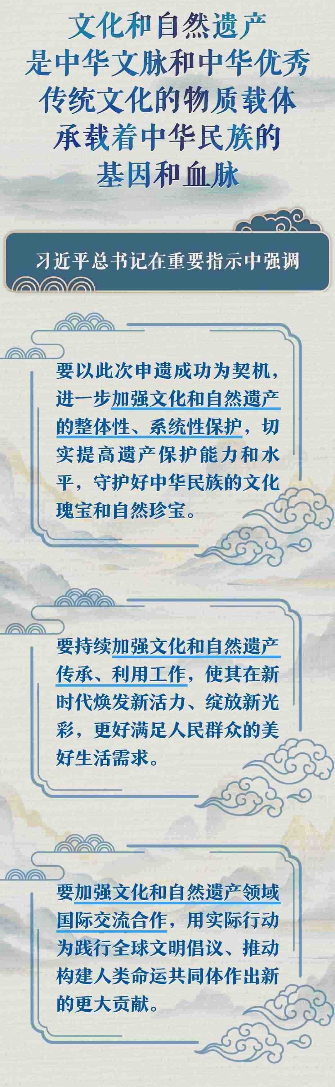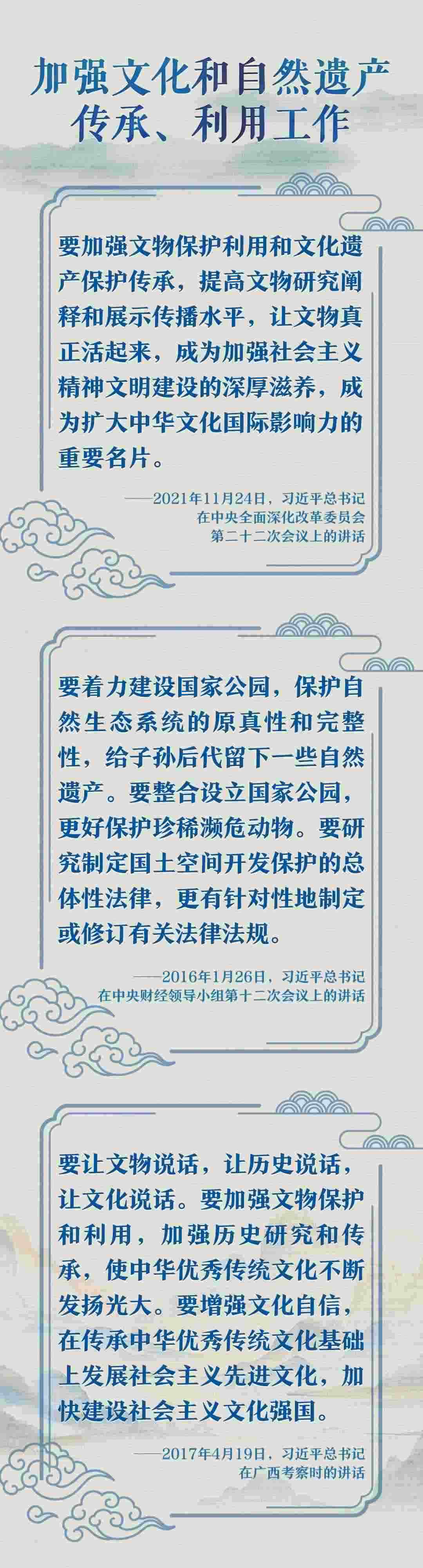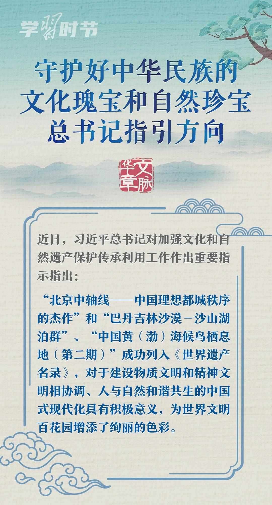 文化遺產(chǎn)體現(xiàn)了中華民族旺盛的生命力和創(chuàng)造力,自然遺產(chǎn)昭示了神奇的自然造化同中華民族的和諧依存關(guān)系。習(xí)近平總書記一直以來高度重視文化和自然遺產(chǎn)保護(hù)傳承利用工作,近日專門就此作出重要指示強(qiáng)調(diào),守護(hù)好中華民族的文化瑰寶和自然珍寶,讓文化和自然遺產(chǎn)在新時代煥發(fā)新活力綻放新光彩。讓我們一同學(xué)習(xí)。