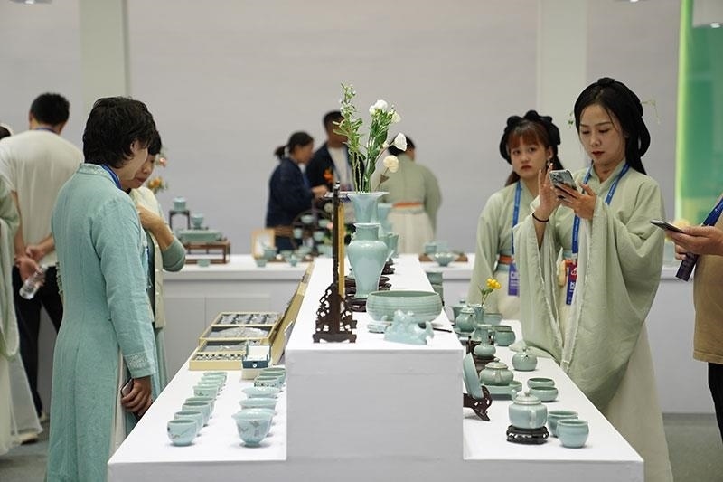 △2023年10月18日,人們在2023中國景德鎮(zhèn)國際陶瓷博覽會汝窯展臺參觀。