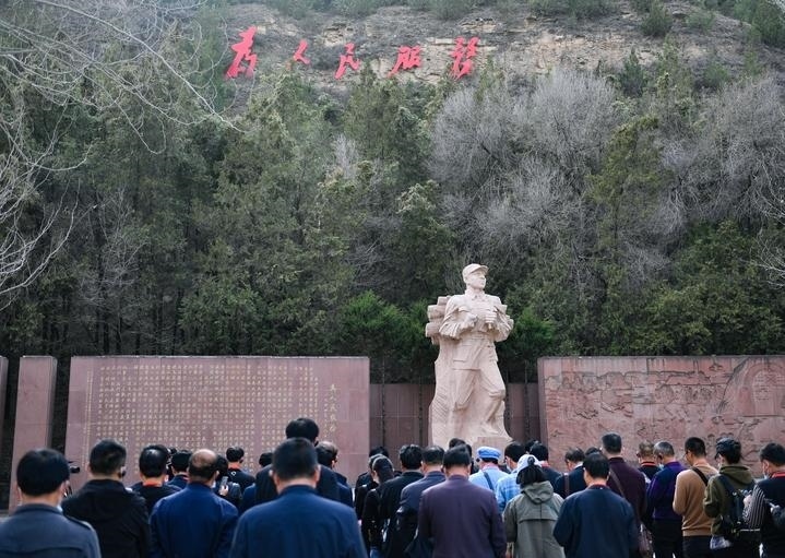 參觀者在延安棗園《為人民服務(wù)》講話紀(jì)念廣場(chǎng)參觀。新華社記者 張博文 攝