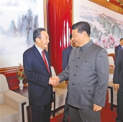 2021年7月1日,慶祝中國共產黨成立100周年大會在北京天安門廣場隆重舉行。這是慶祝大會前,習近平同志與吳邦國同志握手。新華社記者 鞠 鵬攝