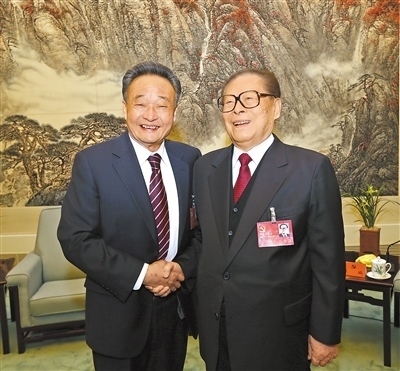 2012年11月14日,中國共產黨第十八次全國代表大會在北京閉幕。這是閉幕會前,江澤民同志與吳邦國同志在一起。新華社記者 蘭紅光攝
