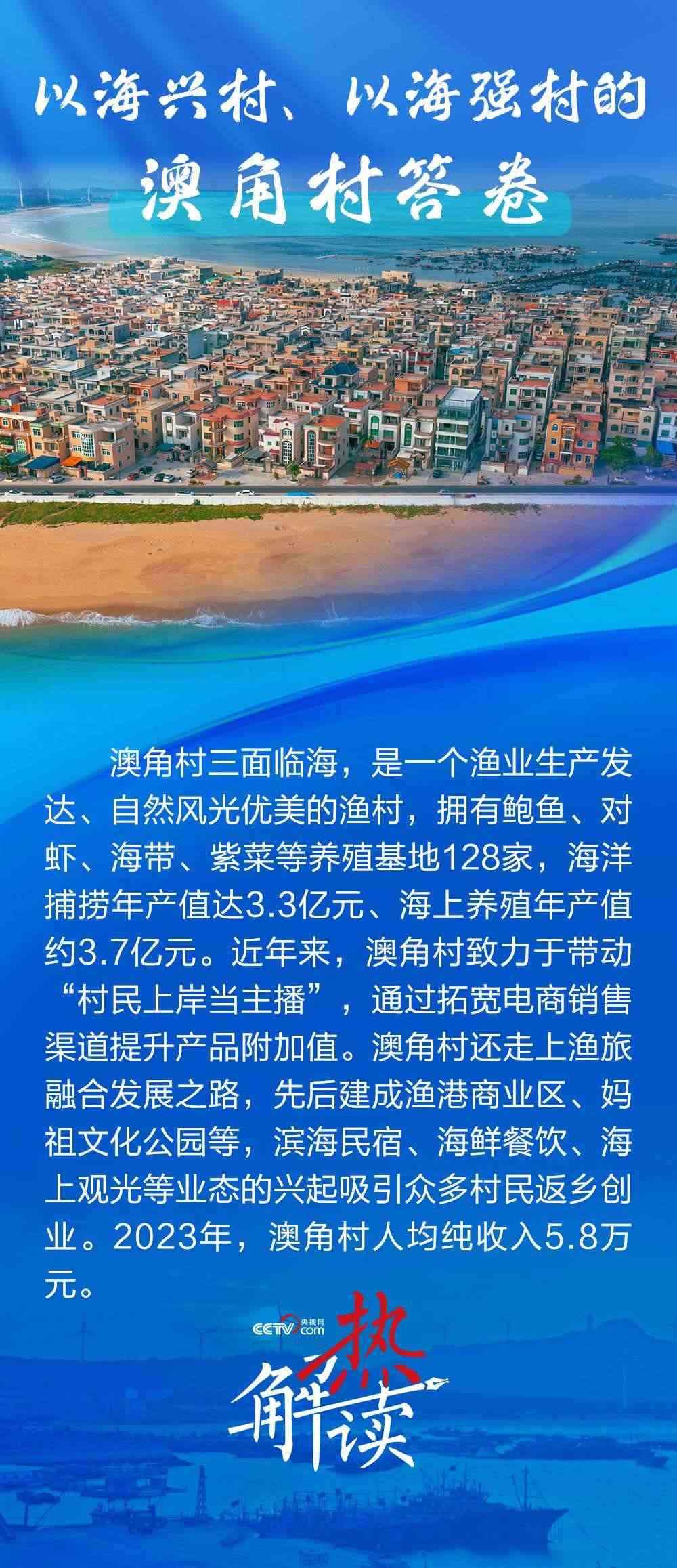 澳角村三面臨海,近年來走出了一條以海興村、以海強(qiáng)村的新路子??吹洁l(xiāng)村發(fā)生了巨變,總書記直言“鄉(xiāng)村振興還是要發(fā)揚(yáng)優(yōu)勢(shì)”,并勉勵(lì)澳角村做好“?!钡奈恼拢卩l(xiāng)村振興、共同富裕的道路上一往無前。
