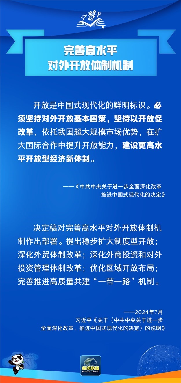 今年7月,黨的二十屆三中全會審議通過《中共中央關(guān)于進(jìn)一步全面深化改革 推進(jìn)中國式現(xiàn)代化的決定》。這份綱領(lǐng)性文件明確提出,“完善高水平對外開放體制機(jī)制”。