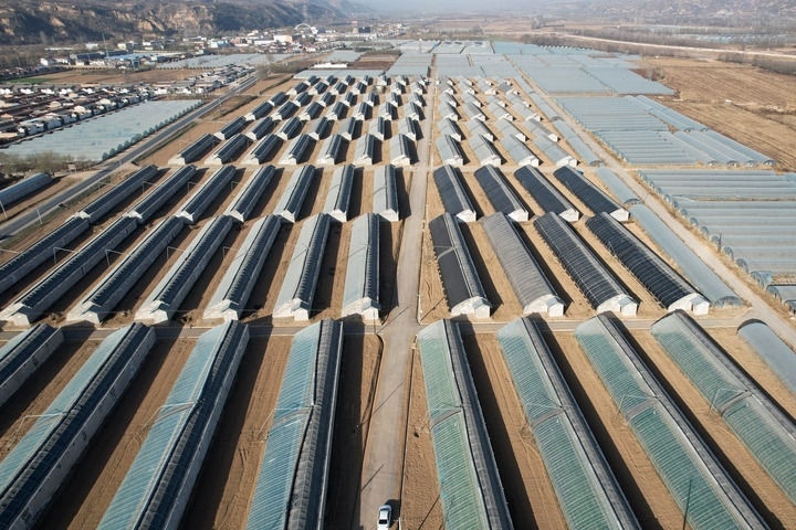 2023年11月26日,甘肅省平?jīng)鍪袥艽h涇汭河川區(qū)萬畝設(shè)施蔬菜產(chǎn)業(yè)園王村核心區(qū)(無人機照片)。這是當(dāng)?shù)匾劳刑旖蚴袞|西部協(xié)作幫扶資金實施的聯(lián)建項目。新華社記者 范培珅 攝
