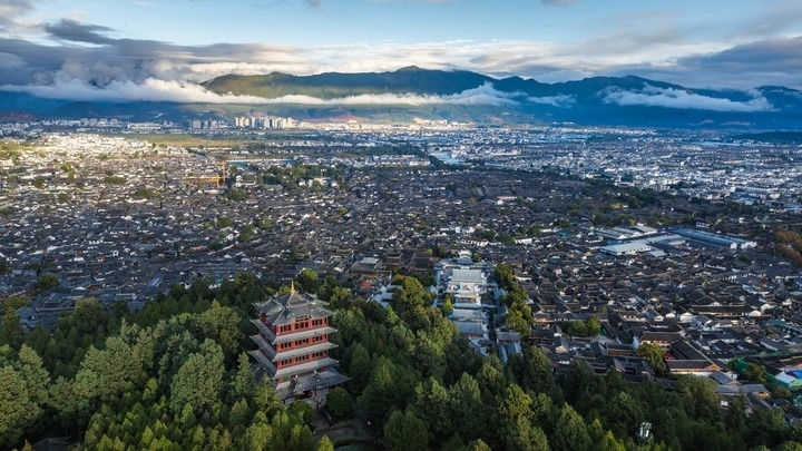 2024年11月8日,麗江古城日落風(fēng)光(無人機照片)。新華社記者 胡超 攝