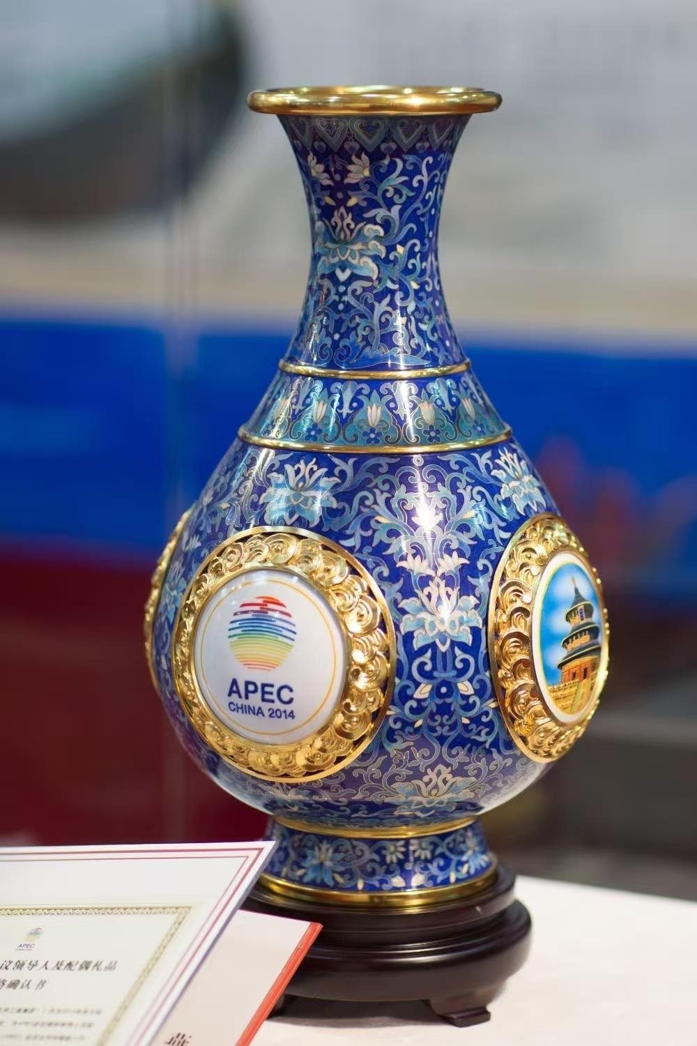 2014年11月,北京APEC會議在雁棲湖畔舉行。為歡迎參會的各經(jīng)濟(jì)體領(lǐng)導(dǎo)人,習(xí)近平主席選定了一件國禮——“四海升平”景泰藍(lán)賞瓶。賞瓶的細(xì)節(jié)蘊含巧思:瓶高38厘米,是天壇祈年殿38米的等比例縮小;最大直徑21厘米,代表APEC的21個經(jīng)濟(jì)體。碧藍(lán)的瓶身雕著水紋,既象征“四?!币泊憝h(huán)太平洋?!捌俊笔恰捌健钡闹C音,連起來即“四海升平”。