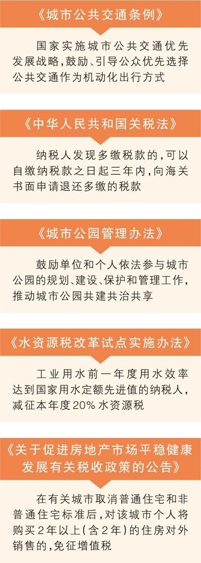 編者按:鼓勵、引導(dǎo)公眾優(yōu)先選擇公共交通作為機(jī)動化出行方式;保持現(xiàn)行關(guān)稅稅制基本穩(wěn)定;鼓勵單位和個(gè)人參與城市公園的規(guī)劃、建設(shè)、管理……12月起,《城市公共交通條例》《中華人民共和國關(guān)稅法》《城市公園管理辦法》等一批法律法規(guī)正式施行,切實(shí)以法治力量推動經(jīng)濟(jì)社會高質(zhì)量發(fā)展。