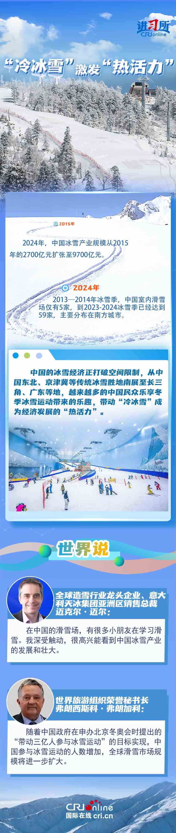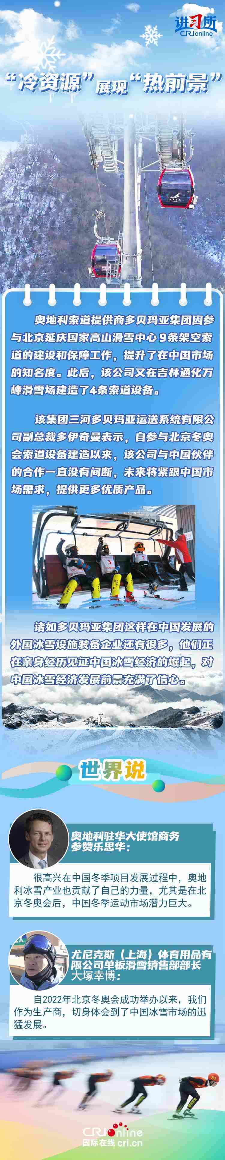 去年年底,中國國務(wù)院辦公廳印發(fā)《關(guān)于以冰雪運動高質(zhì)量發(fā)展激發(fā)冰雪經(jīng)濟活力的若干意見》,旨在鞏固和擴大“帶動三億人參與冰雪運動”成果,以冰雪運動為引領(lǐng),帶動冰雪文化、冰雪裝備、冰雪旅游全產(chǎn)業(yè)鏈發(fā)展,推動冰雪經(jīng)濟成為新增長點。不少國際組織、企業(yè)和媒體認為,中國冰雪經(jīng)濟的蓬勃發(fā)展,不僅帶來新合作機遇,更為全球冰雪市場貢獻力量。