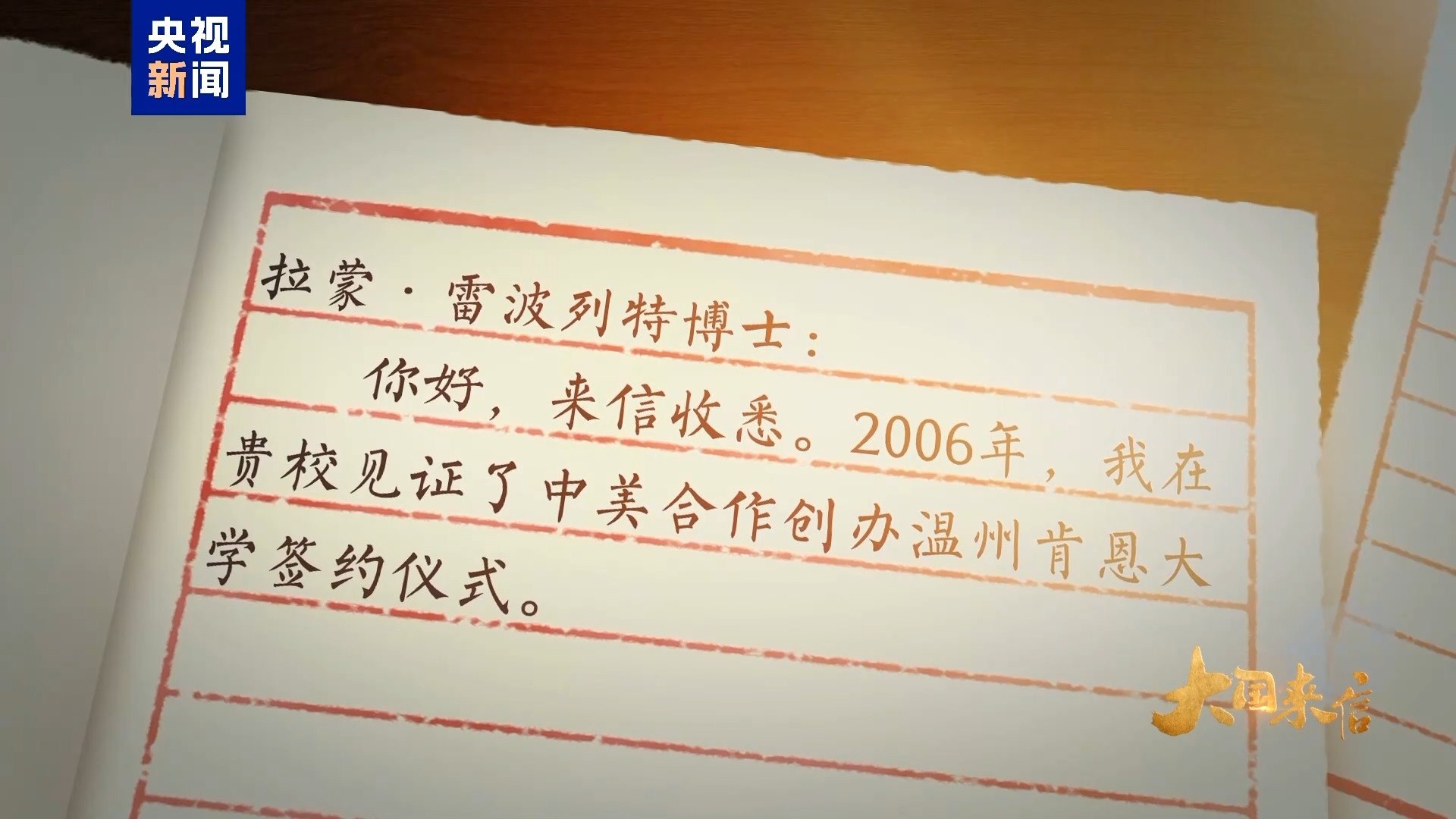 錦書云中來,尺牘傳深情。2006年,時(shí)任浙江省委書記習(xí)近平在美國肯恩大學(xué)見證了中美合作創(chuàng)辦溫州肯恩大學(xué)的簽約儀式。自2014年設(shè)立以來,溫州肯恩大學(xué)不僅培養(yǎng)了數(shù)千名中外學(xué)子,還推動(dòng)了中美兩國青年一代的友好交流。去年6月,習(xí)主席復(fù)信美國肯恩大學(xué)校長拉蒙·雷波列特,鼓勵(lì)中美兩國高校加強(qiáng)交流合作,為促進(jìn)中美友好貢獻(xiàn)力量。