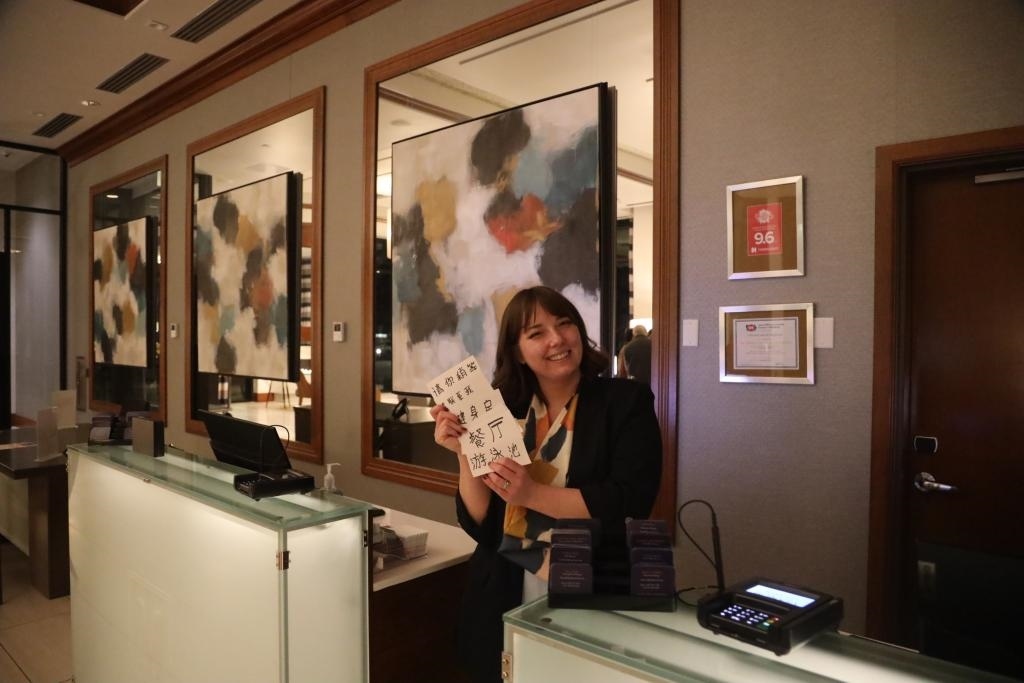 “請您稍等”“請聯(lián)系我”……在中國學生們?nèi)胱〉木频辏芭_工作人員謝伊·馬丁提前準備了厚厚一疊中文指引卡片,讓很多第一次海外過年的中國小客人感到心里暖暖的。