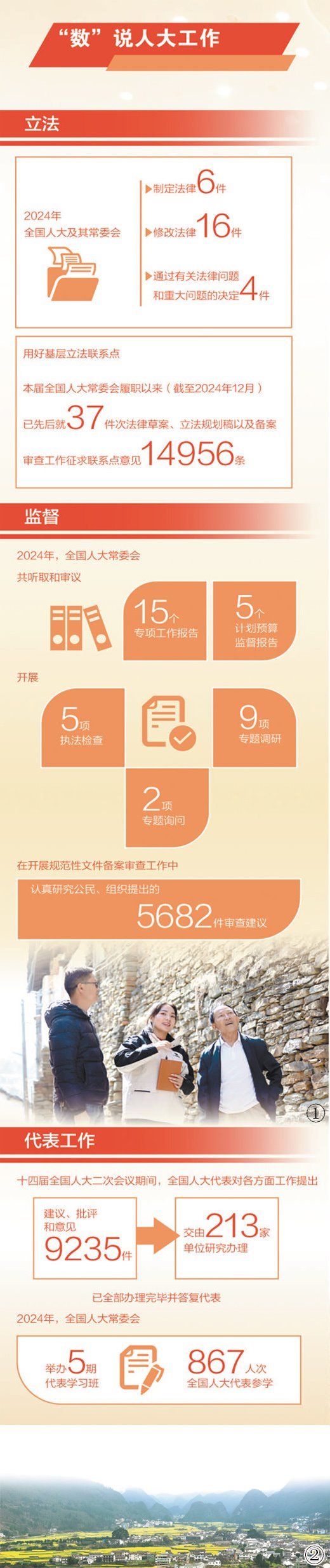 2024年,全國人大常委會綜合運(yùn)用法定監(jiān)督方式,統(tǒng)籌安排聽取審議工作報(bào)告、執(zhí)法檢查、專題詢問、專題調(diào)研等,注重把監(jiān)督與立法、與法治宣傳結(jié)合起來,推動憲法法律全面有效實(shí)施,督促國家機(jī)關(guān)把法律執(zhí)行到位、落到實(shí)處,推動從制度上、法律上解決問題。