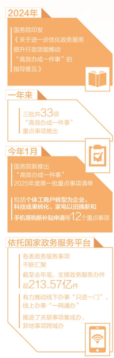 政府工作報告提出,“健全‘高效辦成一件事’重點事項清單管理和常態(tài)化推進機制,完善覆蓋全國的一體化在線政務(wù)服務(wù)平臺。”
