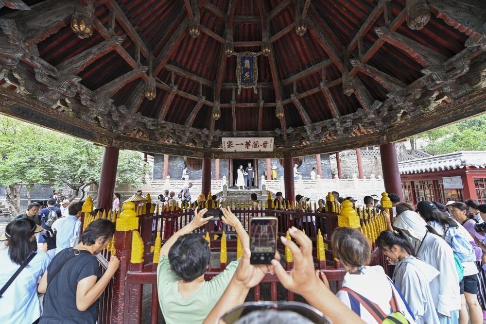 位于太原的晉祠,是祭祀西周初晉國首任諸侯唐叔虞的祠堂,是集中國古代祠祀建筑、園林、雕塑、壁畫、碑刻藝術(shù)于一體的珍貴的千年古祠,是首批全國重點文物保護單位之一。這是2024年7月25日,游客在晉祠博物館參觀。