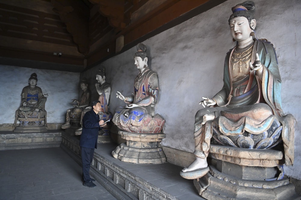 2024年3月16日,在山西長子縣法興寺圓覺殿,天王寺法興寺崇慶寺文物所副所長張宇飛記錄宋代彩塑的保存狀況。張宇飛從1993年開始擔(dān)任法興寺文保員,在日常講解之余,他通過查閱史料、研讀碑文、請教專家、走訪鄉(xiāng)民等方式,挖掘文物背后的故事,通過自媒體發(fā)表介紹山西文化遺產(chǎn)的原創(chuàng)文章百余篇。