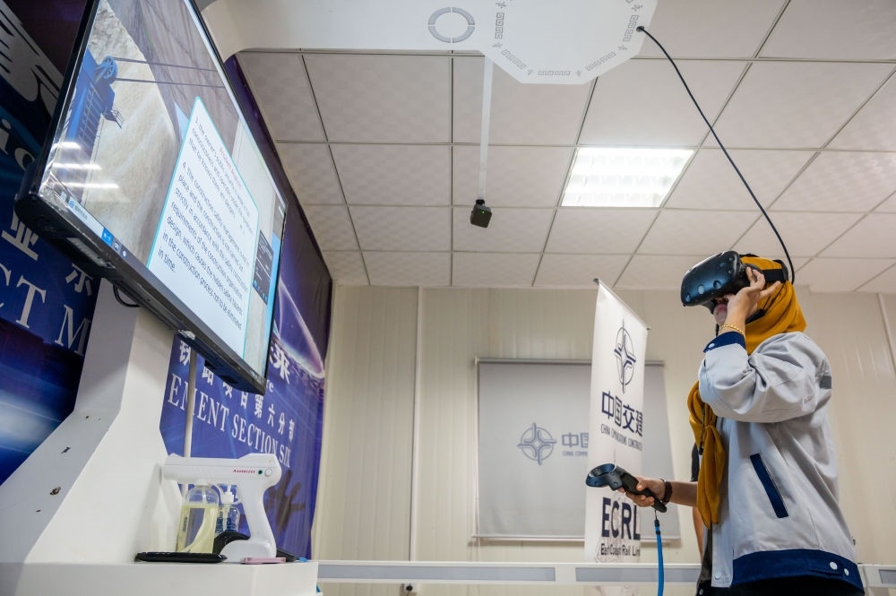 2021年11月9日,在位于彭亨州馬蘭的馬來西亞東海岸鐵路項目安全教育培訓中心,一名工作人員借助VR技術學習安全知識。為確保項目安全推進,中國交通建設集團有限公司在承建的馬東鐵項目沿線設立了多個虛擬現(xiàn)實和實體體驗安全教育培訓中心,借助沉浸式3D技術與VR設備,模擬了近百種潛在的施工現(xiàn)場危險情況,有效提升了項目員工的安全意識和技能水平。
