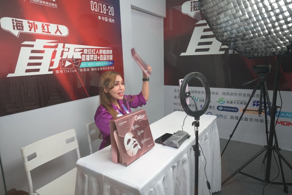 2024年3月18日,一名馬來西亞主播在福建福州舉行的第四屆中國跨境電商交易會展會現(xiàn)場直播帶貨。