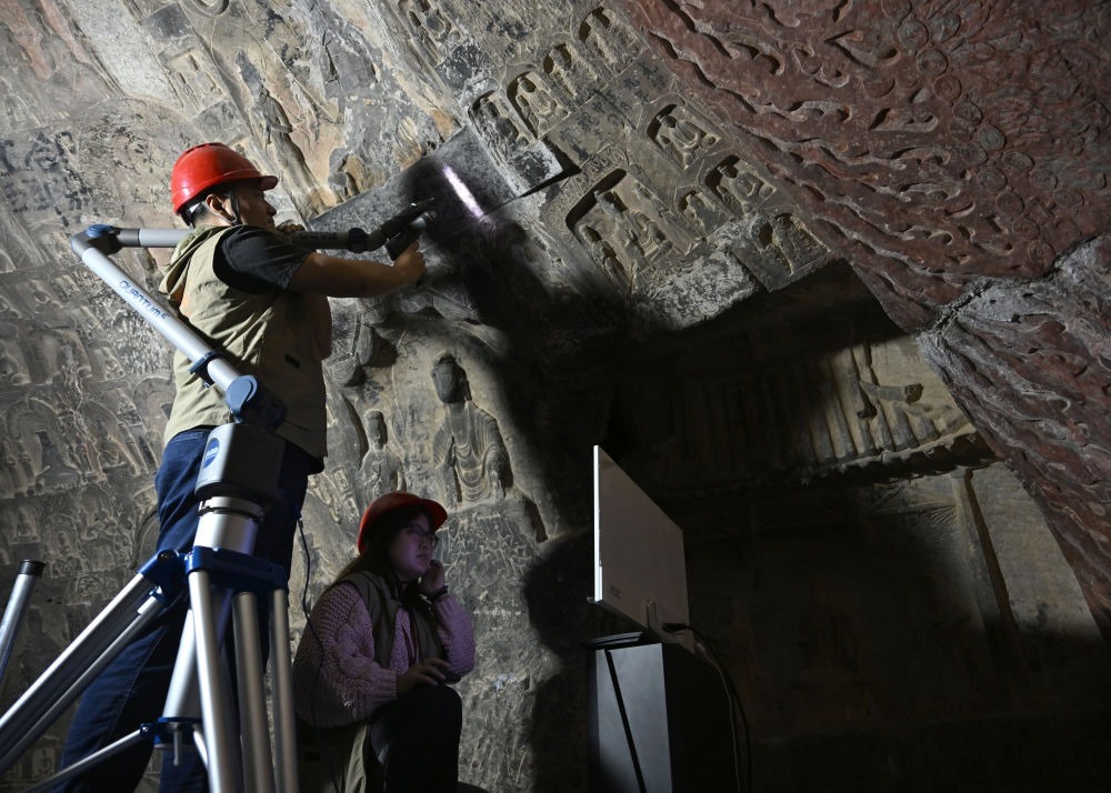 2025年4月9日,龍門石窟研究院工作人員在古陽洞使用關節(jié)臂掃描儀對像龕進行數字化掃描。