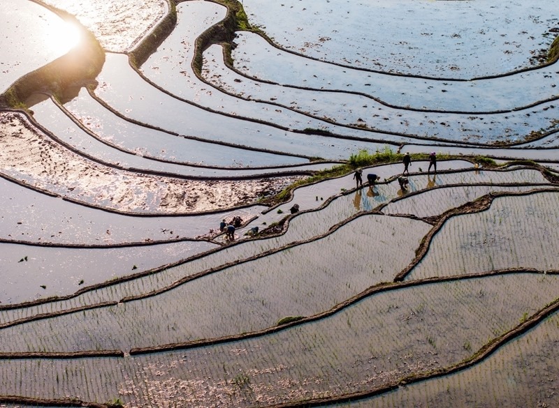 6月11日,湖北省秭歸縣沙鎮(zhèn)溪鎮(zhèn)長春村村民在水田里插秧(無人機照片)。