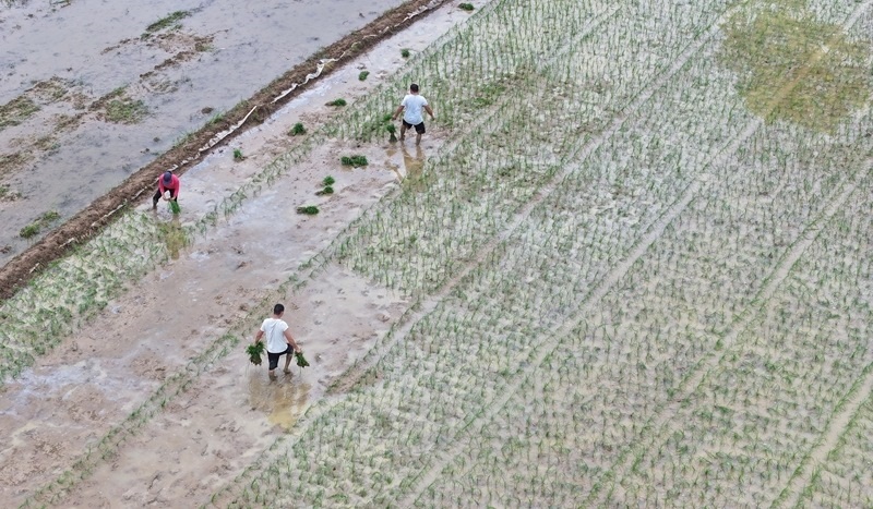6月11日,在浙江省臺州市仙居縣雙廟鄉(xiāng),農(nóng)民在田間起運秧苗(無人機照片)。