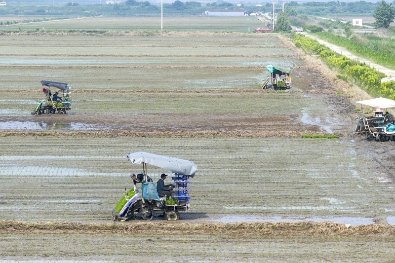6月12日,在浙江省余姚市濱?,F(xiàn)代農(nóng)業(yè)先導區(qū),農(nóng)機手駕駛插秧機進行制種水稻插秧(無人機照片)。