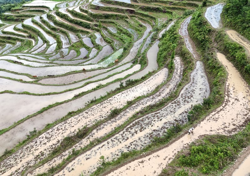 6月14日,在浙江省永嘉縣茗岙鄉(xiāng)梯田,農(nóng)民進(jìn)行水稻插秧準(zhǔn)備工作(無(wú)人機(jī)照片)。