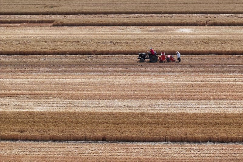 6月10日,在山東省聊城市茌平區(qū)博平鎮(zhèn)任何村,農(nóng)民駕駛農(nóng)機(jī)播種玉米(無(wú)人機(jī)照片)。