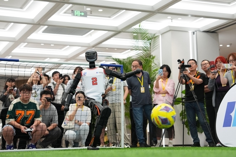 6月17日,加速進化Booster T1機器人在北京經開區(qū)的機器人大世界展示“大力射門”。