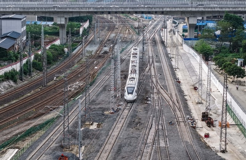 6月19日,在成渝中線高鐵成都站南北站場(chǎng)交替施工現(xiàn)場(chǎng),中鐵八局施工人員在拆除原來的軌道和枕木,上方中國(guó)中鐵電氣化局的施工人員在進(jìn)行接觸網(wǎng)施工作業(yè)。