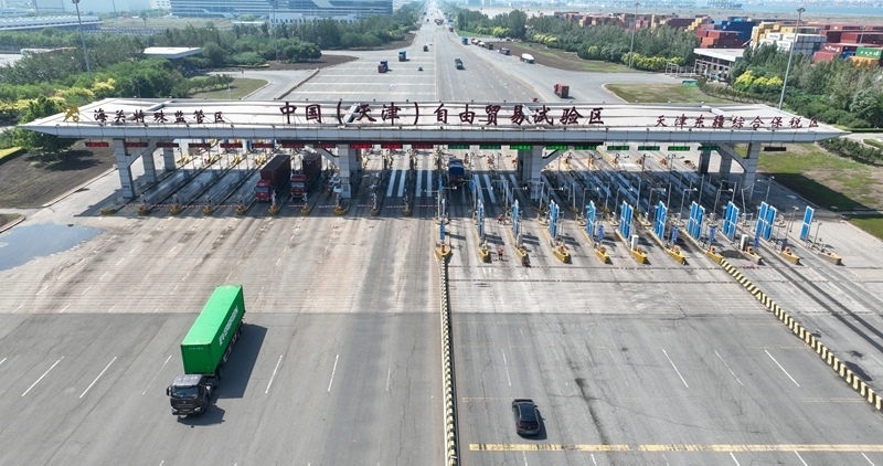 這是6月20日拍攝的天津自貿(mào)區(qū)天津港東疆片區(qū)入口處的中國(天津)自由貿(mào)易試驗區(qū)海關特殊監(jiān)管區(qū)入口(無人機照片)。