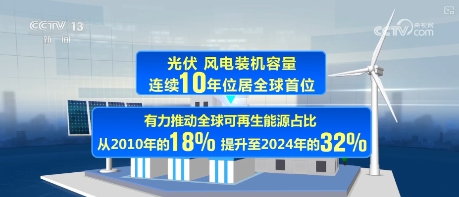 《報(bào)告》指出,作為全球最大能源消費(fèi)國與清潔能源投資國,2024年,中國清潔能源投資規(guī)模為6250億美元,占全球比重的三分之一。光伏、風(fēng)電裝機(jī)容量連續(xù)10年位居全球首位,有力推動(dòng)全球可再生能源占比從2010年的18%提升至2024年的32%。