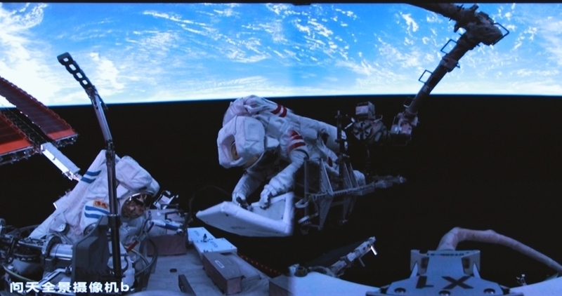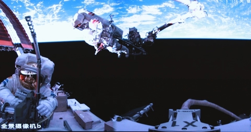 這是6月26日在北京航天飛行控制中心屏幕上拍攝的神舟二十號(hào)航天員陳冬(左)與陳中瑞在空間站組合體艙外工作的畫(huà)面。新華社發(fā)(周柯毅 攝)
