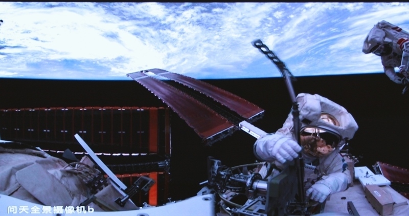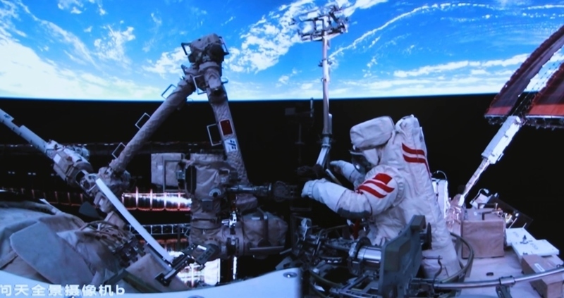 這是6月26日在北京航天飛行控制中心屏幕上拍攝的神舟二十號(hào)航天員陳中瑞在空間站組合體艙外工作的畫(huà)面。新華社發(fā)(周柯毅 攝)