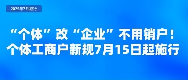 市場監(jiān)管總局近日發(fā)布《個體工商戶登記管理規(guī)定》,規(guī)定于7月15日起正式施行。規(guī)定明確個體工商戶可以通過變更登記方式轉(zhuǎn)型為企業(yè),保留統(tǒng)一社會信用代碼、成立時間、名稱字號和相關(guān)行政許可。規(guī)定完善了登記規(guī)則,個體工商戶經(jīng)營場所發(fā)生變化時,可以像企業(yè)一樣辦理跨區(qū)域遷移。規(guī)定還明確了個體工商戶經(jīng)營權(quán)繼承的相關(guān)要求,為老字號“換人不換招牌”提供制度保障。